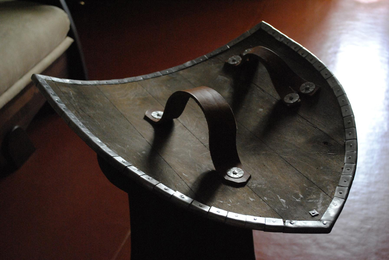 Щит - преспособление для активной защиты воина, а также ностиель герба и хранитель чести. Вопреки расхожему мнению что все рыцарские щиты стальные - это не так. В рыцарские времена щиты были деревянные, больше - почти в человеческий рост, покрытые кожей и/или тканью. Также применялись металлические детали. На заре эпохи рыцарства часто применялась округлая железная выпуклая центральная бляха - умбон и железная окантовка покраям.