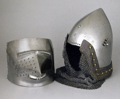 Все перечисленные шлемы были изготовлены в период 1440-1450 гг., все они имеют полусферическое забрало, густо перфорированное вентилляционными отверстиями, с центральным ребром жесткости.