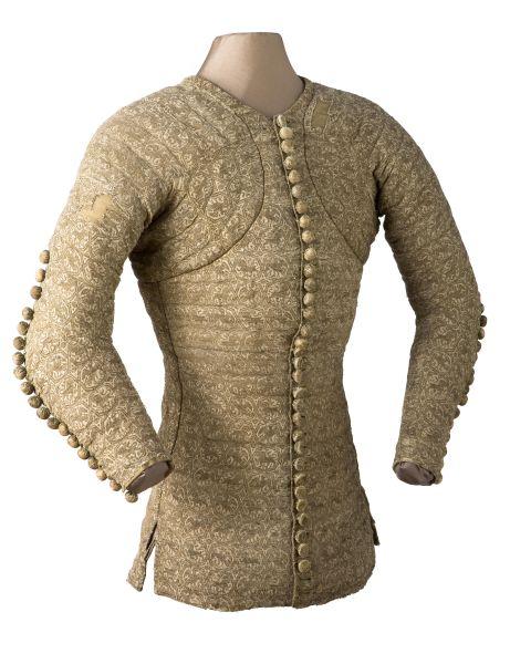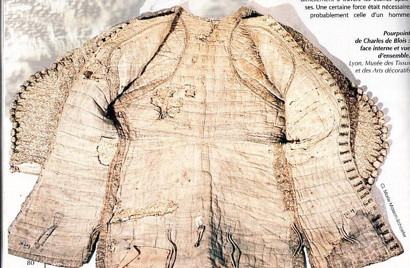 В Музее истории тканей в Лионе хранится оригинальный жюпон Карла де Блуа, погибшего в сражении при Оре в 1364 г. Жюпон сшит из золотой парчи, покрытой узором из геральдических львов и птиц, размещенных в восьмигранных медальонах. Проймы на груди и рукавах застегиваются на деревянные, обшитые тканью, пуговицы – плоские ниже пояса, и шарообразные на груди и рукавах. Жюпон радиально простеган на плечах и горизонтально – на передней и задней частях и рукавах. Ширина между линиями стежков на торсе – около 3,5 см.