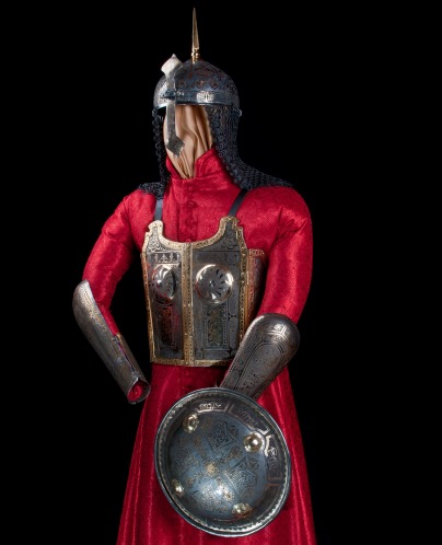 Полный комплект доспехов индо-персидского стиля восемнадцатого века. Комплект состоит из следующих доспехов: кираса - "шар айна (четыре зеркала)", шлем "кулах кхуд" с кольчужной бармицей, щит "калкан" и пара трубчатых наручей "базубанды".