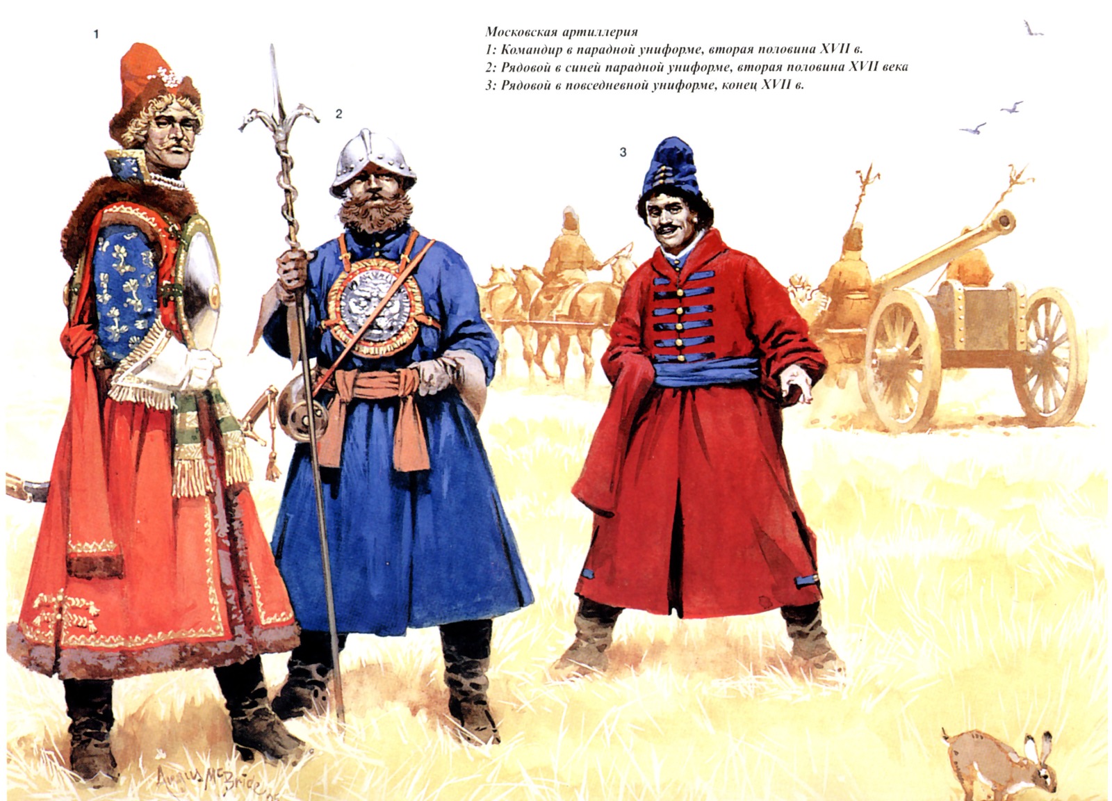 К сожалению, описания иностранцев того времени содержат весьма мимолетные и лаконичные упоминания о пушкарском снаряжении. Например, польские послы в 1667 г. отмечали: «Вся дворцовая площадь была уставлена пехотой, перед которой стояли орудия большого калибра с прислугой, у каждого из коих висел па груди блестящий знак; орудия стояли по обеим сторонам, а было их до сотни»12. Некоторые же иностранцы вообще не останавливались на описании одеяния пушкарей, ограничиваясь рассказом о церемониале. Так, Б. Тайнер коротко заметил: «200 пушек, стоявших дулами одна против другой; некоторые имели по три отверстия, были различным образом расписаны и окружены многочисленным караулом»13.