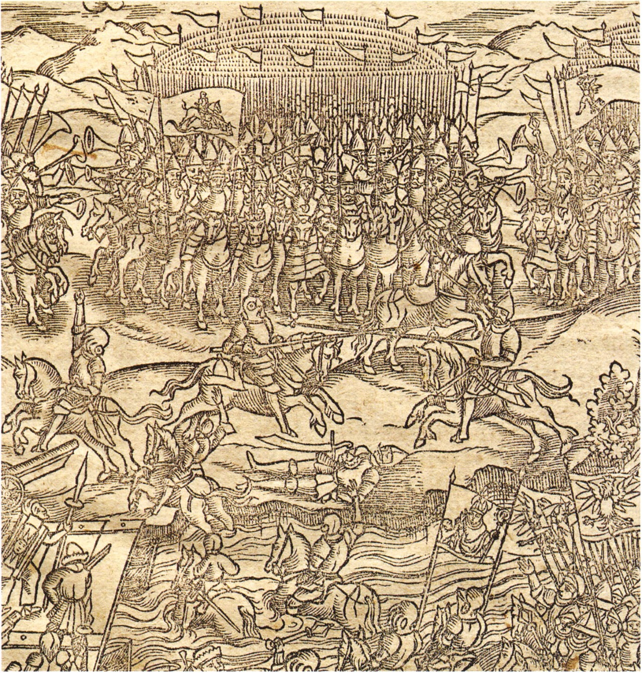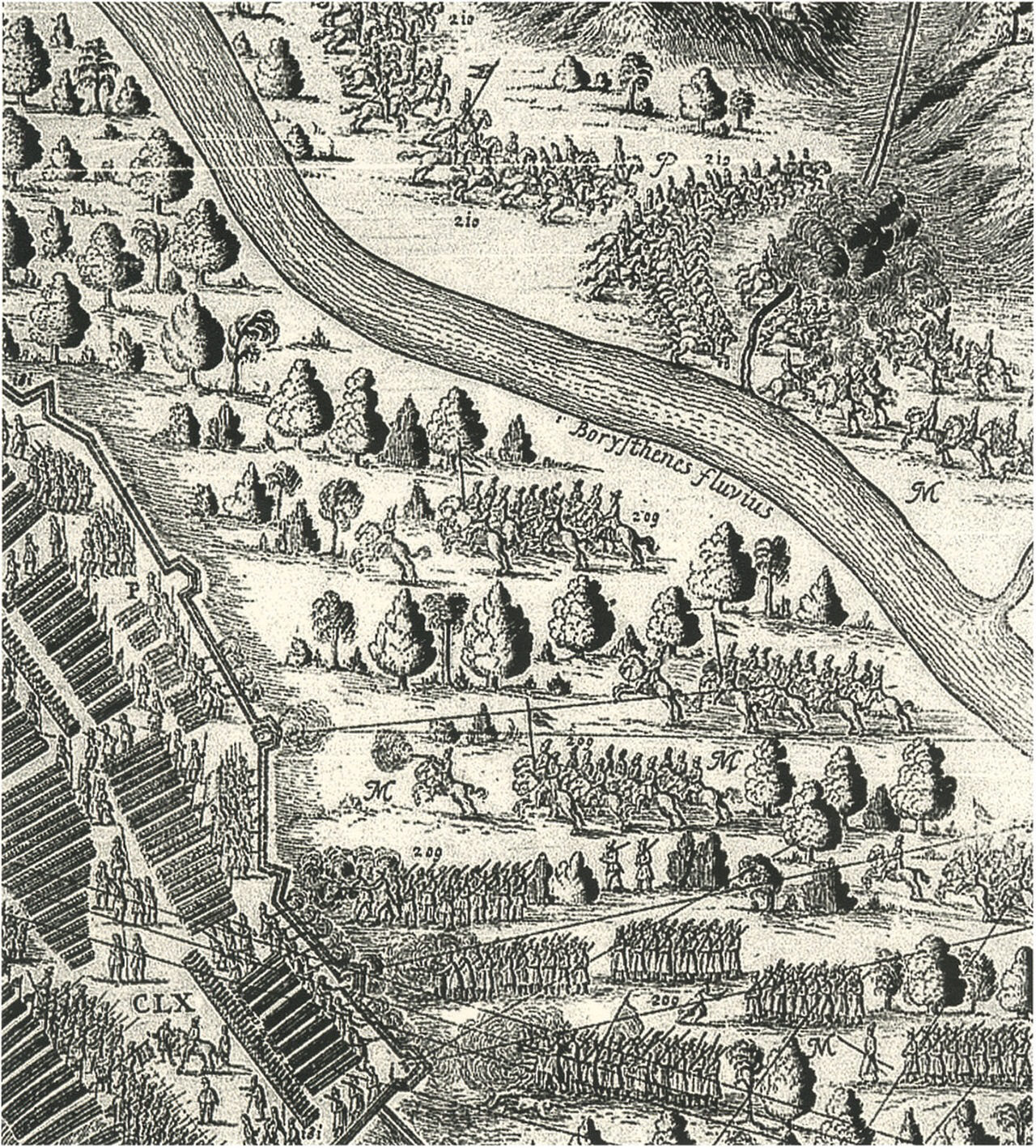 Сотни московской конницы, атакующие королевский лагерь под знамёнами с двумя «клинцами» или «хвостами» в 1633 г. Виллем Гондиус. «План осады Смоленска...».