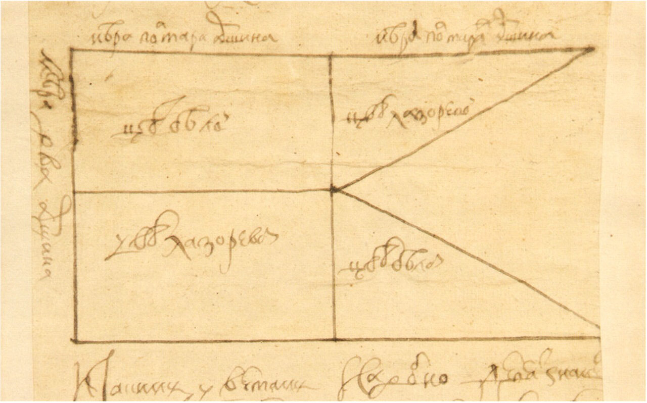 Рисунок — «образец», присланный из Приказа Казанского дворца 11 марта 1675 г., по которому Казённый приказ сделал 17 двуцветных и 3 белых тафтяных знамени вместо запрошенных дорогильных уфимским служилым людым для «низового» похода воеводы Андрея Леонтьева.