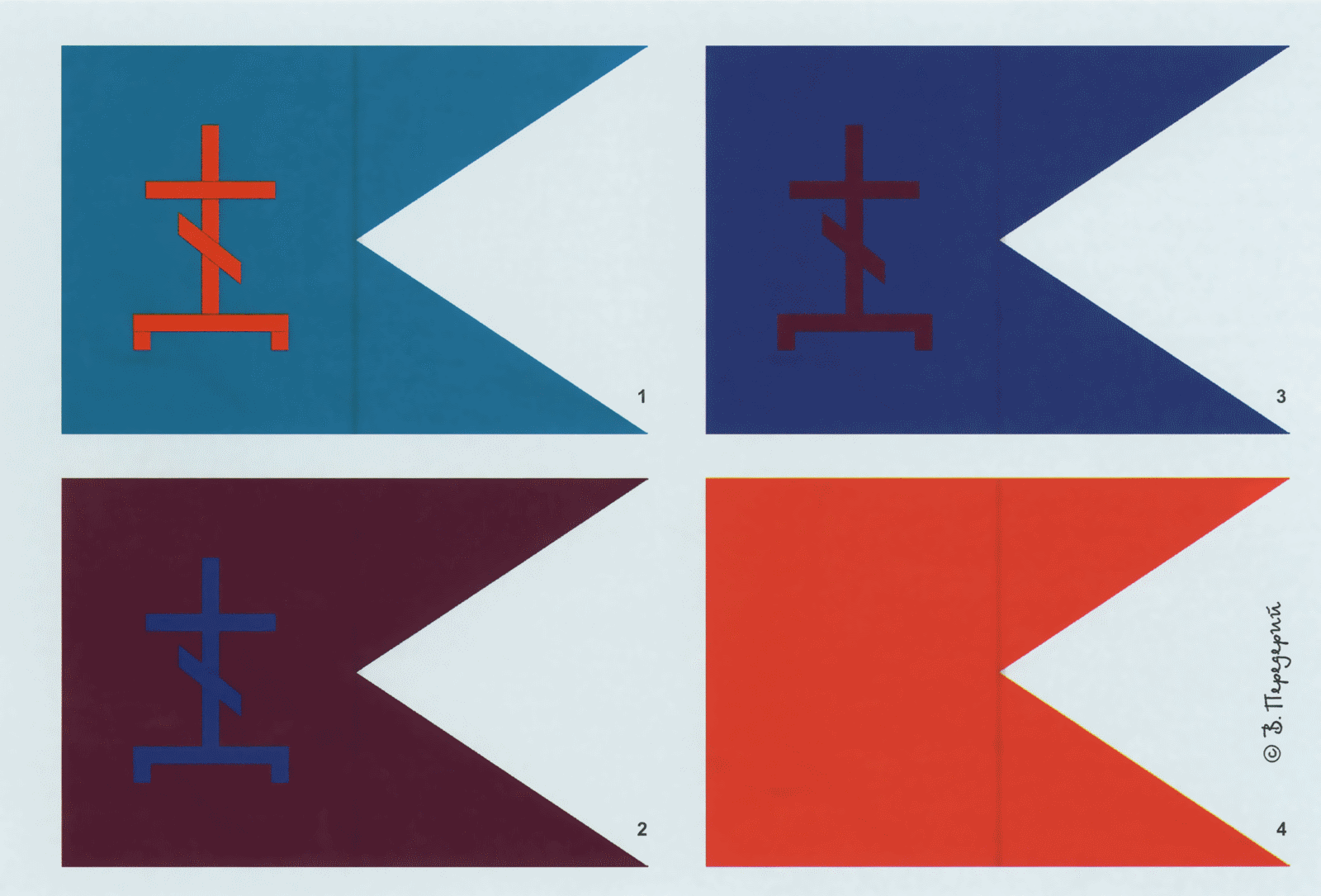 1. Вариант реконструкции казачьего знамени станицы атамана Алексея Кухтина, на которую атаман получил материю в Казённом приказе 13 июля 1614 г. 2-3. Варианты реконструкции казачьих знамён станиц атаманов Фёдора Патрикеева и Степана Кузьмина, на которые атаманы получили материю в Казённом приказе 17 сентября 1614 г. 4. Вариант реконструкции казачьего знамени станицы атамана Ивана Адамова, скроенного из полученного 25 июня 1616 г. червчатого киндяка.