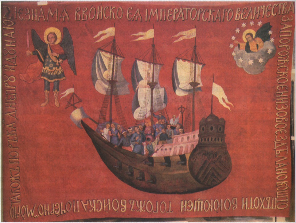 Найвідоміший серед них - „морський прапор Війська Запорозького”, репродукований у багатьох виданнях з історії Запорозької Січі. У центрі його полотнища – зображення вітрильника з козаками на палубі, угорі – традиційні для козацькогопра-порництва образи архангела Михаїла та Христа Спаситсля. Прикметно, що це один з небагатьох прапорів, де центром композиції виступає реалія козацького військового побугу (у даному разі – корабель).
