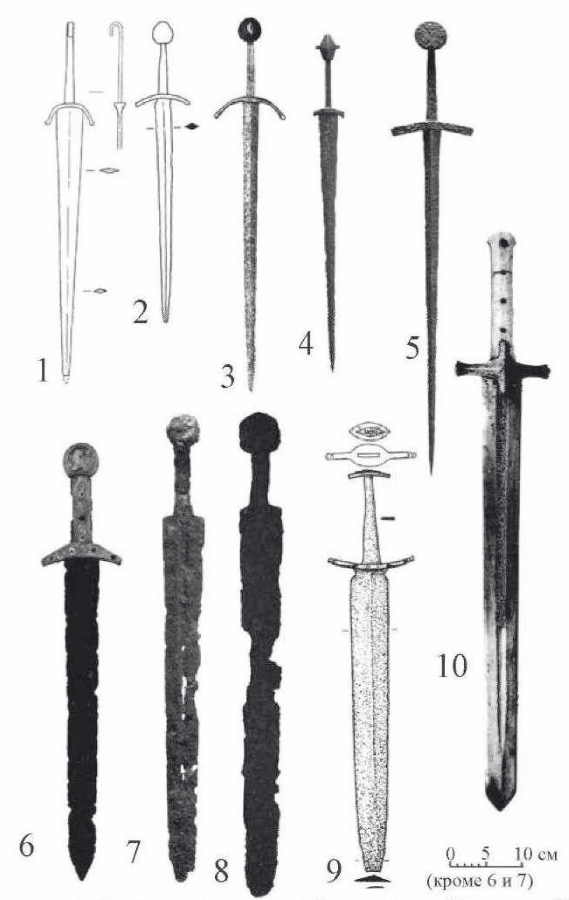 Между тем. среди материалов мусульманского Востока подобное оружие тоже известно; нам удалось отыскать два экземпляра. Первый был найден в пещере на горе Кызыл-Тас (Восточный Казахстан). Он представляет собой широкий обоюдоострый клинок, сечение которого имеет форму неравнобедренного треугольника. На клинке присутствует перекрестье в форме овального щитка с отходящими от него вверх усами. Рукоять венчает эллипсовидное навершие. Размеры находки: общая длина – 60 см. длина клинка – 45 см. ширина клинка у перекрестья - 6 см, у острия – 2 см, длина перекрестья – 13,5 см, размеры навершия - 0,62 х 0,28 см (Плотников, 1990. с. 150-151, рис. 1,1) (рис. 3, 9). Автор публикации Ю.А. Плотников датировал клинок достаточно широко: XII-XIV вв. (Плотников, 1990, с. 152). Второй клинок – это так называемый малый меч султана Мехмеда II (1432-1481 гг.), хранится в коллекции дворца Топкапы. Турция (рис. 3,10). Экземпляр представляет собой оружие с достаточно широким обоюдоострым клинком, с двусторонним долом, по которому с лицевой стороны золотой насечкой нанесена владельческая надпись. На клинке находится перекрестье узкоромбической формы с вытянутыми боковыми усами, которые на концах слегка уплотнены. Рукоять прямая, с костяными обкладками, которые фиксируются четырьмя заклепками и грибовидным навершием. Общая длина оружия – 81 ем. длина клинка – 61 см (Yucel. 2001, р. 130. pi. 89).