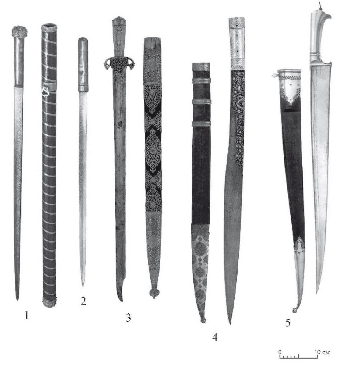 В то же время для мусульманского Востока такой категории специфического оружия исследователями не прослеживается. Между тем, в музейных собраниях и частных коллекциях есть восточное клинковое оружие, которое нс попадает под определения ни сабли, ни меча и значительно превосходит размерами кинжалы и боевые ножи. Так. два интересующих нас клинка хранятся в собрании дворца Тотткатты, в Стамбуле: первый из них принадлежал султану Сулейману Кануни (1520-1566 гг.) (Aydin, 2007, р. 54, №1/74), второй – султану Ахмеду I (1603-1617 гг.) (Aydin, 2007, р. 57, №1/80). Оба предмета представляют собой длинные боевые ножи с треугольным в сечении клинком, общая длина первого – 73 см (рис. 5, 1), второго – 66 см (рис. 5, 2). Еще два интересных клинка происходят из собрания Фарусия. Первый экземпляр представляет собой однолезвийный прямой клинок с напускным перекрестьем, концы которого опущены вниз, к клинку и мощной рукоятью, его общая длина – 76,5 см (рис. 5. 3). Происходит из мусульманской Боснии (Mohamcd, 2008, р. 150. №42). У второго клинка слегка выгнута спинка, и присутствует расширение со стороны лезвия, в нижней половине, общая его длина – 81,2 см (рис. 5, 4). Клинок принадлежал турецким султанам: или Баязиду II (1481-1512 гг.), или Селиму Явузу (1512-1520 гг.) (Mohaincd, 2008, р. 56, №21). Еще одно интересное оружие происходит из известной коллекции Насера Халил и. Это длинный боевой нож, иранский по происхождению, клинок у которого вытянуто-треугольной формы, с двумя долами под спинкой, общая длина оружия – 75 см (Alexander, 1992, р. 138-139, №80) (рис. 5, 5). Все эти вещи поздние, к сожалению, из-за скудной археологической базы (Nicolle. 1999, р. 115-268; Shihab al-Sarraf, 2002, p. 149-178) мы не можем говорить о существовании данной категории оружия в этом регионе в XIII-XIV вв. Между тем, если обратиться к золотоордынским памятникам, то среди археологического материала можно выделить ряд весьма примечательных находок. Ранее они не были замечены специалистами-оружиеведами, либо неверно ими атрибутированы.