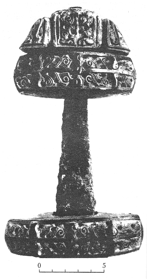 Украшениям обсуждаемого меча посвятила свое сообщение Л.Тунмарк-Нюлен, выступившая на конференции «125 лет изучения Гнездова» в Государственном Историческом музее в Москве состоялась 22-25 ноября 1999 г.) (см. статью .ТТунмарк-Нюлен в настоящем сборнике). Она продемонстрировала ряд изделий эпохи викингов, найденных на о. Готланд. Таковыми оказалась в основном круглые коробчатые фибулы, на вторых, особенно на их боковых сторонах, представлены узоры, совершенно тождественные украшениям рукояти гнёздовского меча (Thun-nurk-Nylen, 1983. P. 11-21. Fig. 4, 8, 15, 34; 1995. Abb. 45a, 1; 49a, 2; 307, 1; 335, 1; 339, 1). Такое совпадение, конечно, не случайно и свидетельствует о том, что рассматриваемая рукоять была заполнена под воздействием скандинавского, ютнее - готландского искусства, а мастером был к славянин, а, по-видимому, готландец. Точное место изготовления оружия Л.Тунмарк-Нюлен не определяет, но справедливо указывает, что нахождение по-готландски оформленной рукояти меча sue не свидетельствует о том, что в кургане Ц-2 был погребен именно выходец из Готланда.