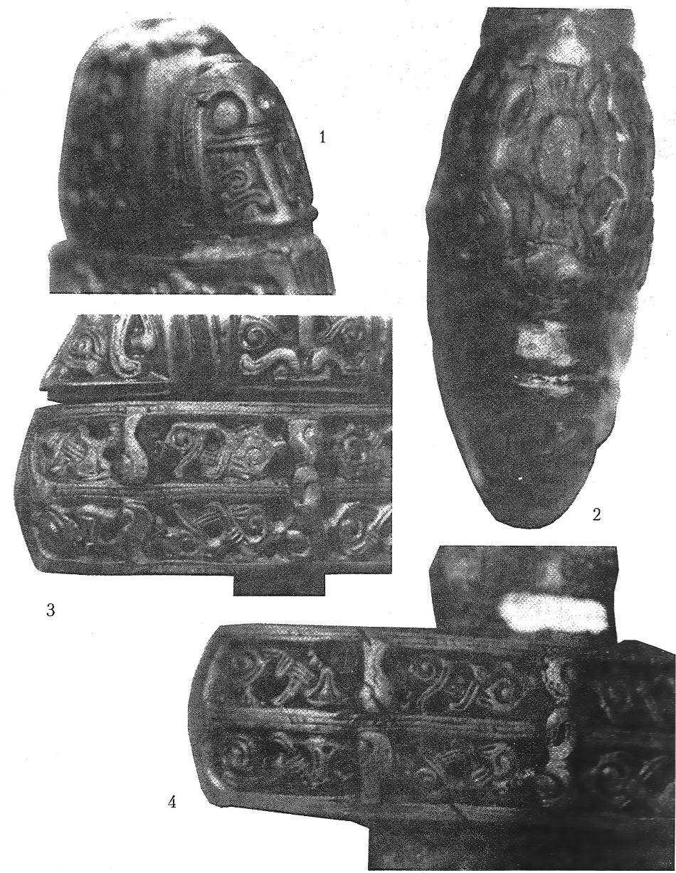 1 - головка навершия, вид сбоку; 2 - навершие, вид сверху, 3 - основание навершия, 4 - перекрестие. Фото А. Кирпичникова