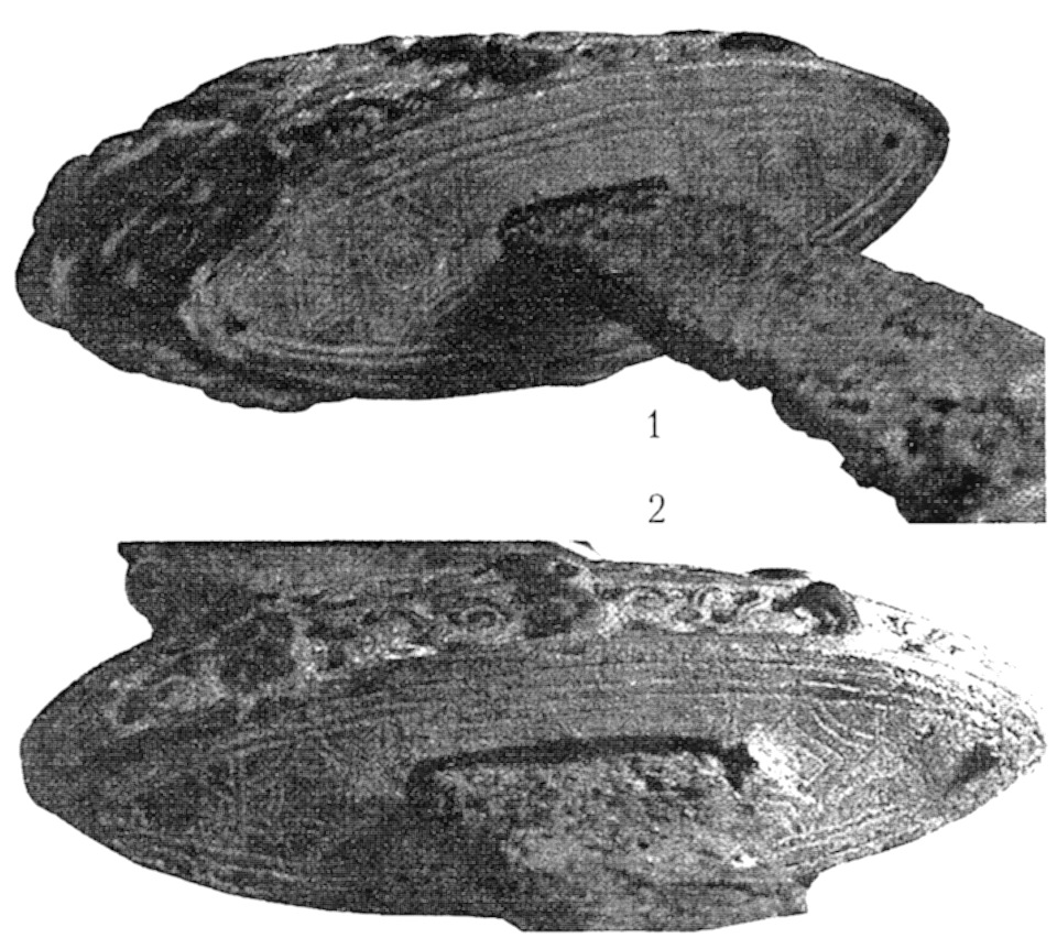 | Рис. 3. Перекрестье (1) и навершие (2). Орнамент на торцевых плоскостях. Фото Д.А. Авдусина | Рис. 4. Прорисовка клейма меча. Рисунок А.Н. Кирпичникова |