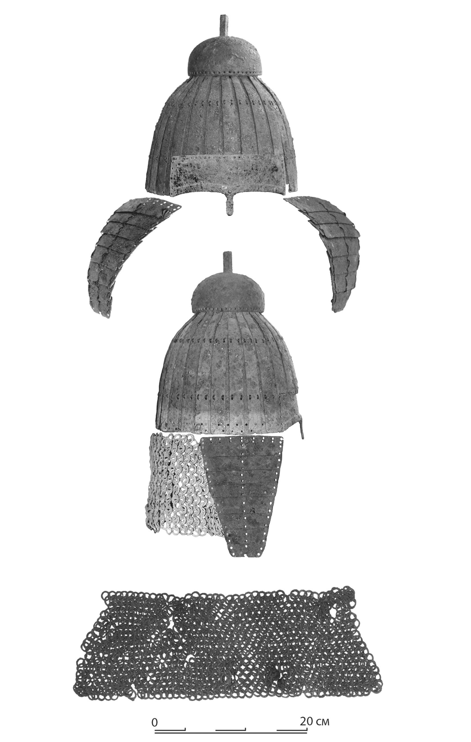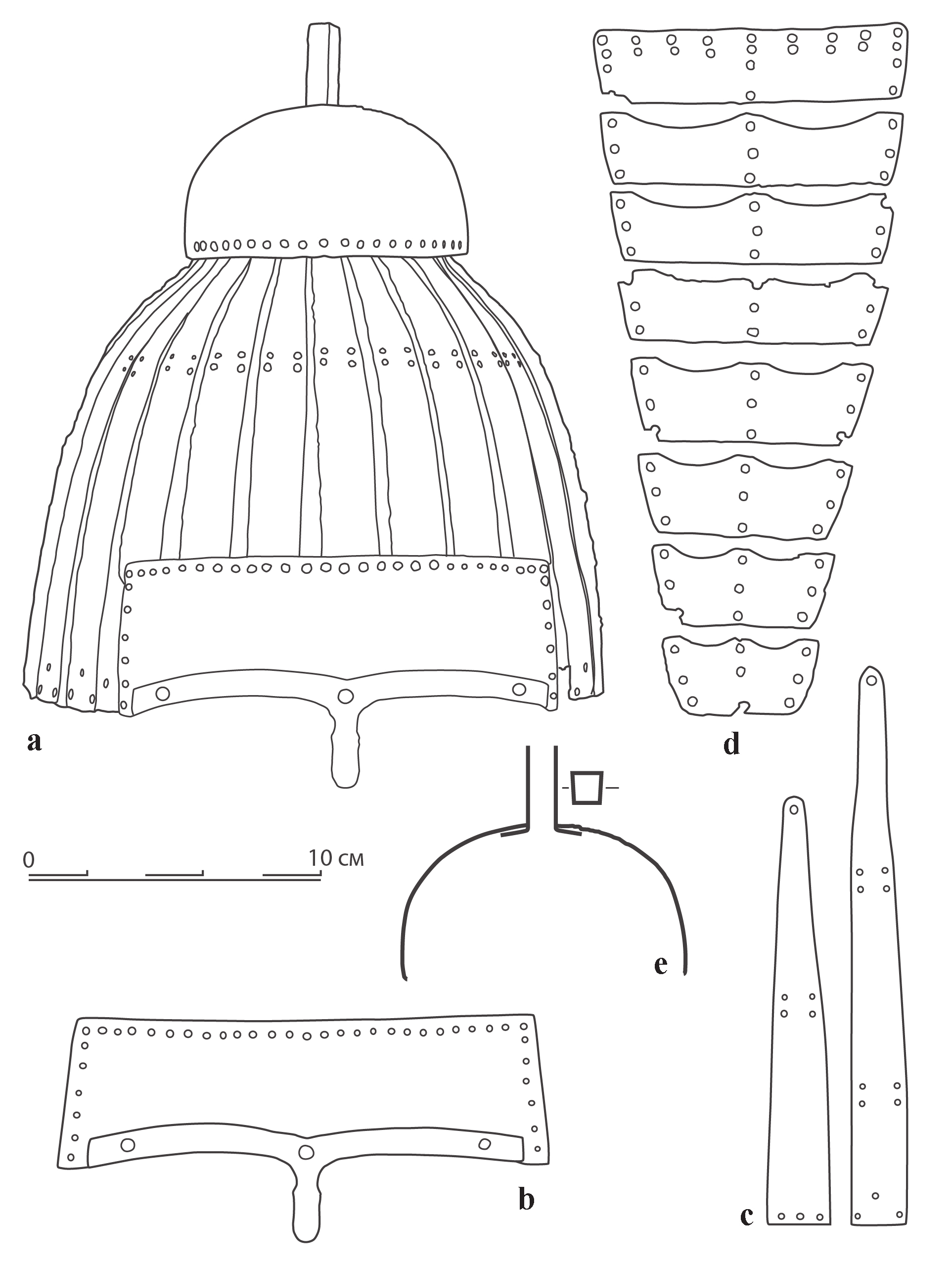 Шлем состоит из нескольких деталей: купола набранного из узких пластин (Рис.2с), налобной пластины с наносником (Рис.26) и цельнометаллическим навершием (Рис.2а), пластинчатых ламинарных наушей (Рис.26), кольчужной бармицы (Рис.1).