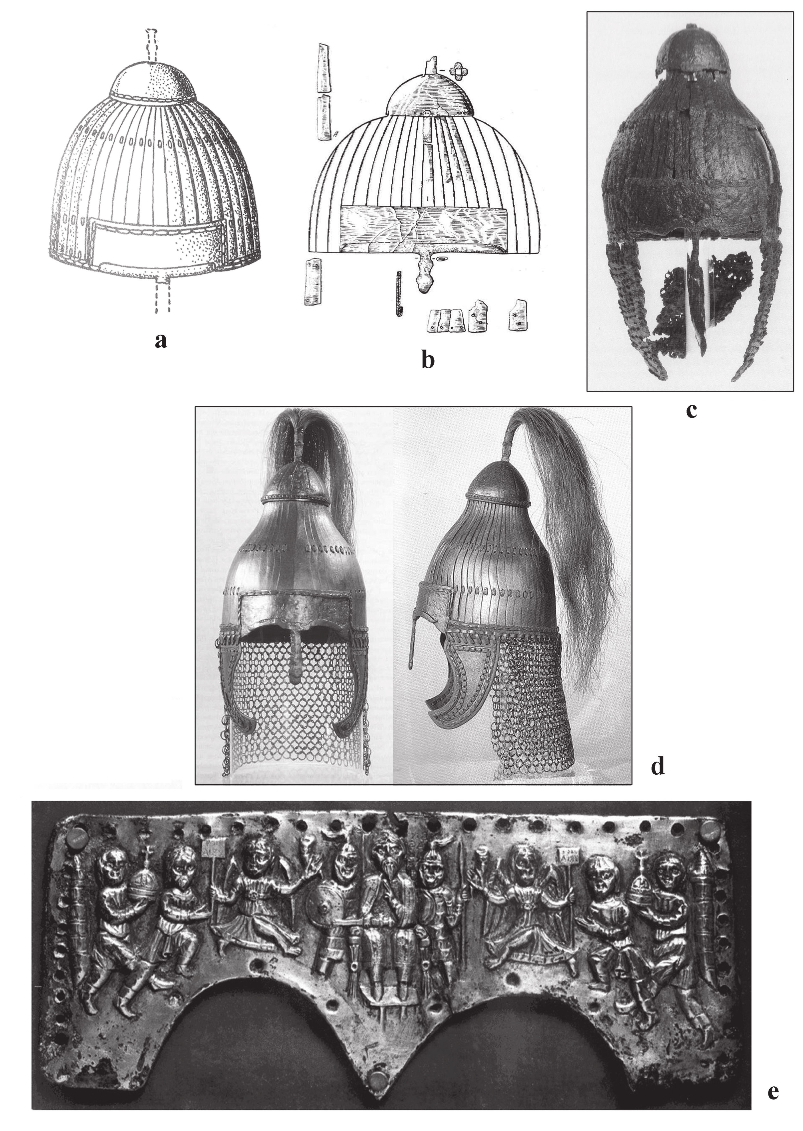 Традиционно происхождение таких шлемов в Европе связывалось с кочевническими влияниями. На территории Европы известны находки четырех целых шлемов, и нескольких деталей от них (Steyer. S.198). Наиболее ранние находки относятся к Дальнему Востоку — Сяньбийский могильник Лаохэшень на территории Китая (Рец, Юй Су-Хуа, 1999), корейские гробницы (Barnes, 2001), датирующиеся III-V вв. н.э. В Европе, по всей видимости, ламеллярные конструкции появляются с одной из волн кочевников из Азии, традиционно многие исследователи связывают это с раннеаварским периодом начавшимся в середине VI века. Один шлем был найден Ю.Кулаковским в 1881 году в одном из погребений Керченского некрополя на ул. Госпитальная (Arendt, 1935). В настоящее время он находится на основной экспозиции ГИМ в Москве, однако, кроме публикации В. Арендта, более подробных сведений и точных рисунков его нет (Рис.3а). Авторы публикации доспеха из этой катакомбы соглашаются с мнением других специалистов (П. Паульсена, Б. Тордемана, М. Горелика) и предполагают, что детали доспеха найденные вместе с шлемами датируются достаточно широко VI-VII вв. (Ахмедов, Журавлев, Кубарев, 2003), хотя и отмечается, что в отчете Ю.Кулаковского упоминается монета императора Льва (457-473), что позволяет предполагать более раннюю нижнюю дату, вплоть до второй половины V века. Фрагменты еще одного подобного шлема (Рис.36) были обнаружены в слое разрушения Ильичевского городища (Николаева, 1986. С.185. Табл.1,1). Автор публикации датирует шлем по монетам императора Льва (457-473) и монетам императора Юстиниана (527-565), найденным в слое городища, практически так же, как и шлем из Керчи — от второй половины V века до второй половины VI века (Николаева, 1986. С. 186). Близкий по типу шлем был обнаружен в погребении начала V века из Калкни в Дагестане (Салихов, 1985), однако он не ламеллярный, и значительно отличается по конструкции от основной серии находок в Европе. Шлем найденный вместе с ламеллярным доспехом в Германии в групповом лангобардском погребении 12 из Нидерштоцингера имеет более развитые и модернизированные детали, чем аналогии из Восточной Европы, датируется он рубежом VI/VII или первым десятилетием VII в. н.э. (Paulsen, 1967; Werner, 1988). В конструкции этого шлема (Рис.3Д) использованы цельнометаллические науши, наносник у него длинный, в отличии от более коротких у восточных находок, центральная пластина в куполе имеет ширину, увеличенную в два раза по сравнению с остальными, кроме того, вертикальные пластины купола имеют фигурные вырезы. В начале 2000-х годов в Болгарии в погребении вместе с доспехом был найден еще один почти целый шлем (Рис.3с). Началом VII века датируют и налобную орнаментированную пластину из позолоченной меди от ламеллярного шлема «короля Агилульфа» из Вальдиньеволе, в Тоскане (Рис.3е).