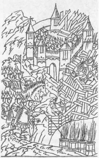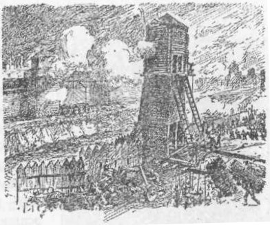 ВТОРАЯ ОСНОВНАЯ ОПЕРАЦИЯ при осаде города состояла в сооружении осадной линии вокруг него из тяжелых орудий и защитных приспособлений. Характер осадной линии четко обрисован в Царственной книге», отдельные моменты иллюстрированы рисунками. На этом основании мы имеем возможность определить до некоторой степени методы осады крепостей, и в частности Казани.