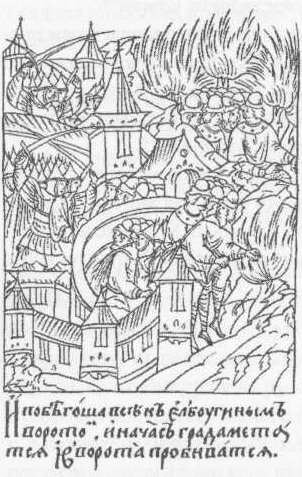 Яркую картину штурма рисует Андрей Курбский. По его словам, двенадцатитысячное войско начало приближаться к Елбуги-ным воротам. Егда же еще быхом недалече от стен, ни из единыя ручницы, або стрелою, на нас стреляно; егда уже близу быхом, тогда первее много огненный бой на нас пущен с стен и с башен; тогда стрел густоспгь такая, яко частость дождя, тогда каме-ния множество бесчисленное, яко и воздуха не видети. Егдаж близу стены подбихомся с великою нуждою и бедою, тогда вары кипящими начата на нас лити и целыми бревны метати».