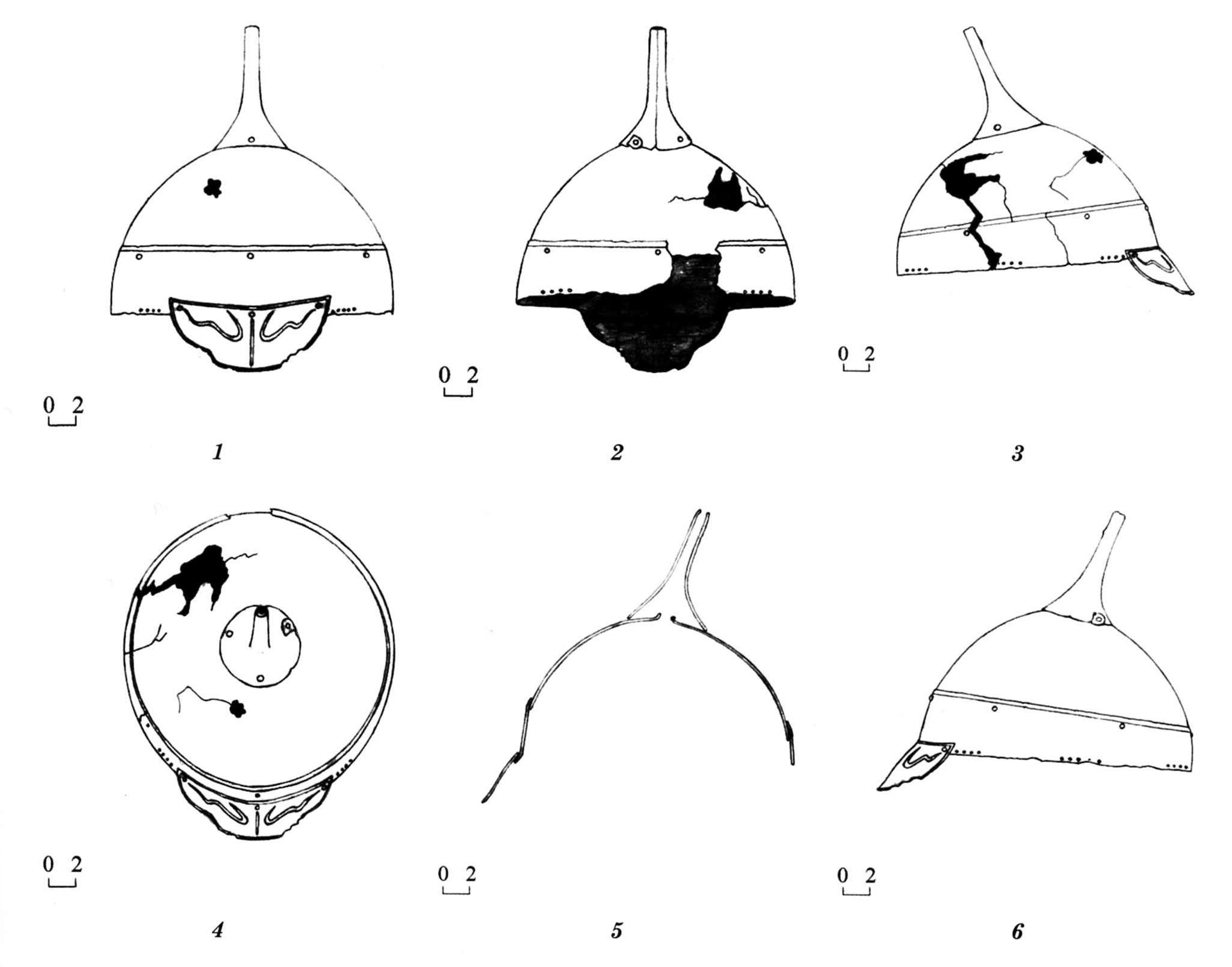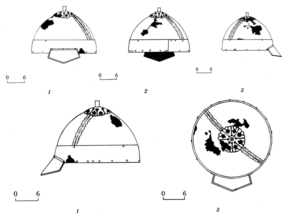 | Рис. 1. Шлемы «цзиньского типа», найденные на Краснояровском городище, Приморье. (по: Артемьева Н.Г. 1999) | Рис. 2. Шлем найденный в предгорьях Алатау, в округе с. Мерке Меркенского района Жамбылской области, Республика Казахстан. (по: Смагу лов Е.А. 1989) | Рис. 3. Шлем из несанкционированных раскопок на городище Козьи скалы, горы Бештау, Ставропольский край. 1 - Вид спереди; 2 - Вид сзади; 3 - Вид справа; 4 - Вид слева; 5 - Вид сверху; 6 - Схема сборки |