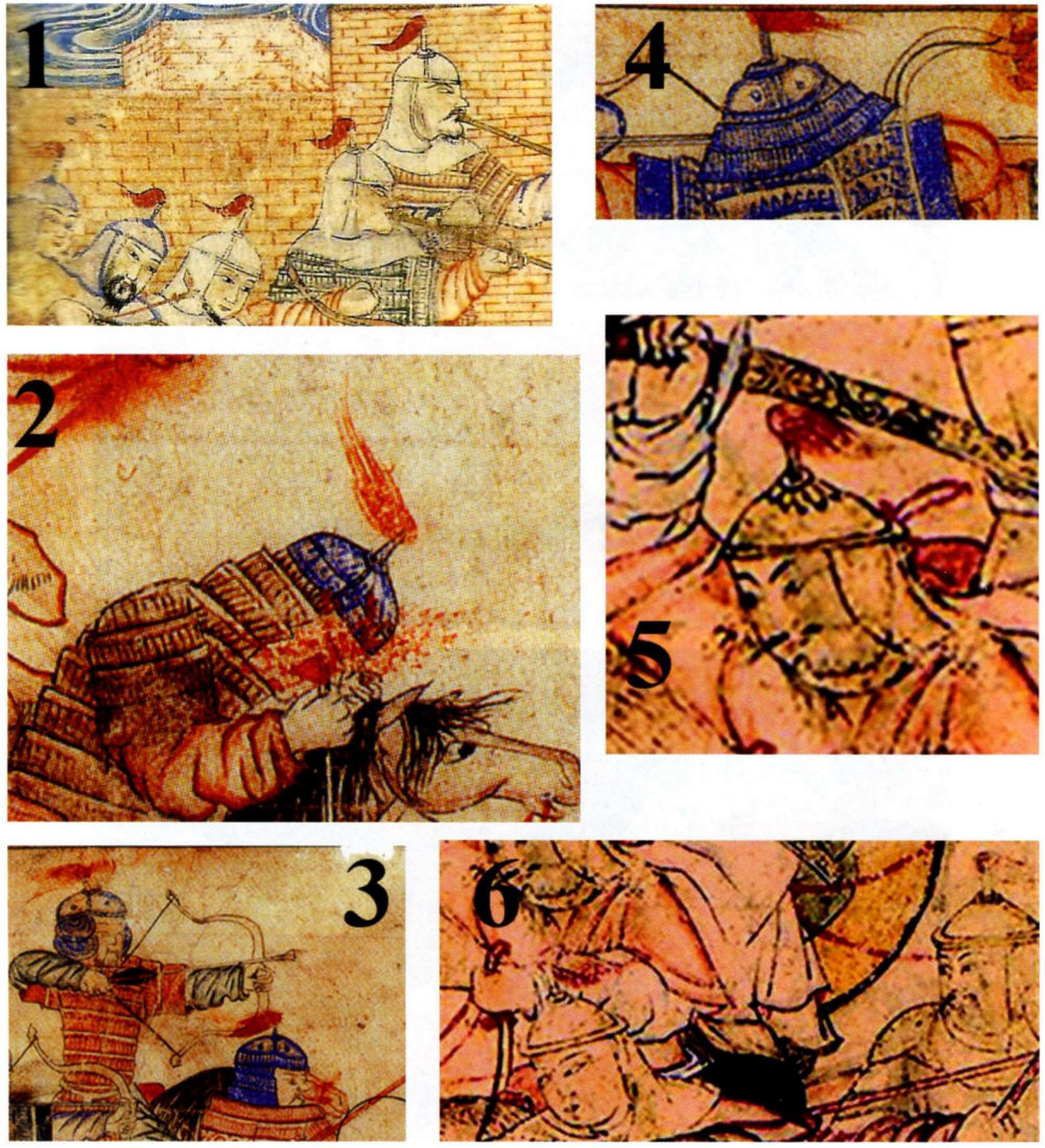 Насколько широко у монголов был распространен этот тип наверший, дают представления миниатюры (рис. 12-13) из так называемого «Альбома Дица» (Берлин, Государственная библиотека – Прусское культурное наследие), где практически у всех монгольских воинов на шлемах изображены подобные навершия. По мнению ряда исследователей, эта серия миниатюр стилевыми особенностями ближе всего восходит к миниатюрам двух сохранившихся (в отрывках) датированных рукописей хроники Рашид ад-Дина — Лондонской (1314 г.) и Эдинбургской (1307 г.) [55, р.15-16; 56, р. 27-45]. Главное их отличие в том, что они создавались мастерами сельджукидской изобразительной традиции [57, с. 36-37], которые, по-видимому, были современниками последнего большого завоевания Монгольской Империи под руководством чингизида Хулагу. Поэтому данные изображения наиболее точно отображают реалии того времени, что делает их для нас бесценными.