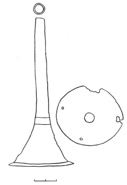 Помимо двух находок с Золотаревского городища, авторы располагают сведеньями еще о двух деталях шлемов. Это два навершия, которые обнаружены в ходе несанкционированных раскопок. Первое навершие найдено браконьерами в 2000-2001 гг., на городище Выжегша, Юрьево-Польский p-он Владимирской обл (рис. 10). Экземпляр абсолютно аналогичен навершиям шлема из Козьих скал и золотаревскому. Отличается навершие тем, что на трубке, чуть ниже верхнего края, с правой стороны от шва, пропилено небольшое круглое отверстие. Высота навершия – 10,5 см, диаметр воронковидного основания – 5,7x5,9 см, диаметр трубки – 1,7 см. Толщина воронковидного основания – 1,5-2 мм, толщина трубки – 2,2 мм. Навершие покрыто толстым слоем окалины, что указывает на то, что оно побывало в огне пожара.