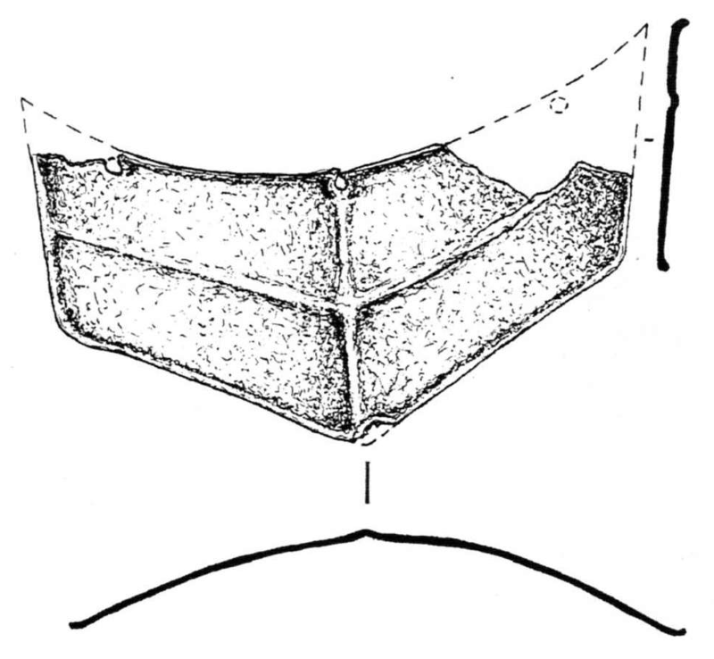 Что касается козырька, то, не так давно, на Шайгинском городище был найден козырек, который достаточно близок козьескальскому [43, с. 200-203] (рис. 4). Он представляет собой достаточно крупную подтрапециевидную пластину, дуговидную в сечении. Длина козырька - 13, 5 см, ширина — 6,2 см, толщина - 1 мм. По центру и ближе к углу, с правой стороны, на козырьке сохранились отверстия. Третье, возможно, располагалось в углу слева, но его разрушила коррозия. По всему периметру козырек окаймлен рантом. По его центру, на всю ширину козырька, от нижнего края до верхнего, проходит прямой тонкий волют. От середины этого волюта, под острым углом, расходятся еще два радиальных. С.Д. Прокопец, который опубликовал эту находку, высказал предположение, что изображение более всего походит на крест [43, с. 200]. Но по нашему мнению, изображение является условной передачей «нахмуренных бровей». Еще одной деталью, которая сближает обе находки, является способ их монтажа. Так, «классические» козырьки фиксируются к тульи посредством отвальцованого под прямым углом внутреннего края козырька, в нашем случае оба козырька монтировались на отвальцованый край тулии.