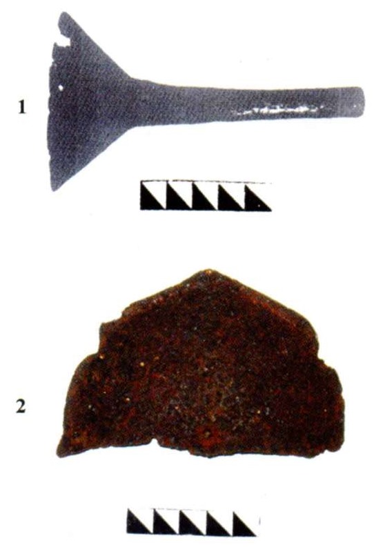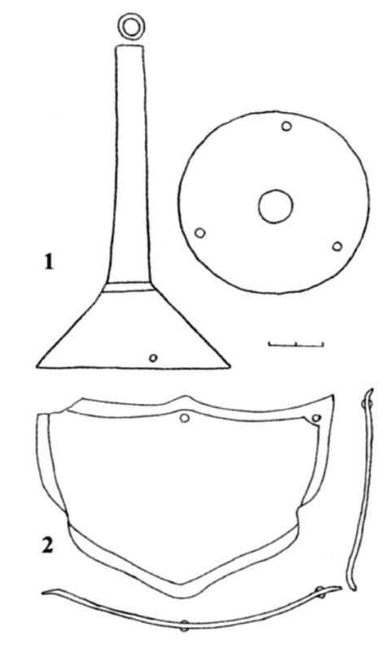 | Рис. 7. Детали шлемов «цзиньского типа» с Золотаревского городища, Пензенская обл. (Прорисовка). 1 - Навершие найденное в раскопе Nq2 второго сектора Золотаревского городища 2 - Козырек найден на 1-м Золотаревском селище с восточной стороны крепости | Рис. 8. Детали шлемов «цзиньского типа» с Золотаревского городища, Пензенская обл. (Фото). 1 - Навершие найденное в раскопе Nq2 второго сектора Золотаревского городища 2 - Козырек найден на 1-м Золотаревском селище с восточной стороны крепости |