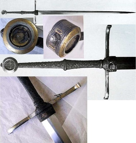 Черен рукояти из древесины ясеня, половина его покрыта кожей. Ножны меча дере
