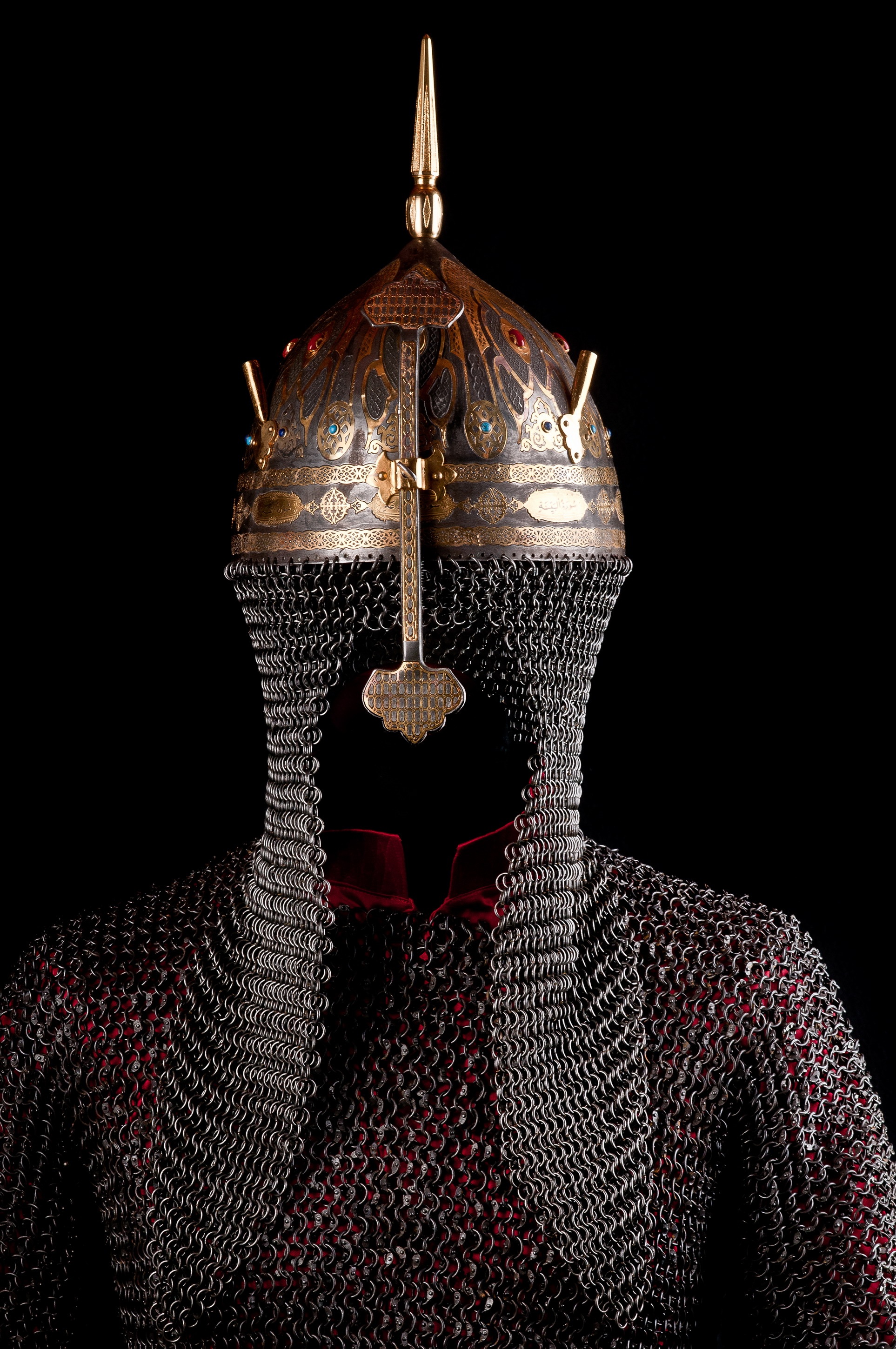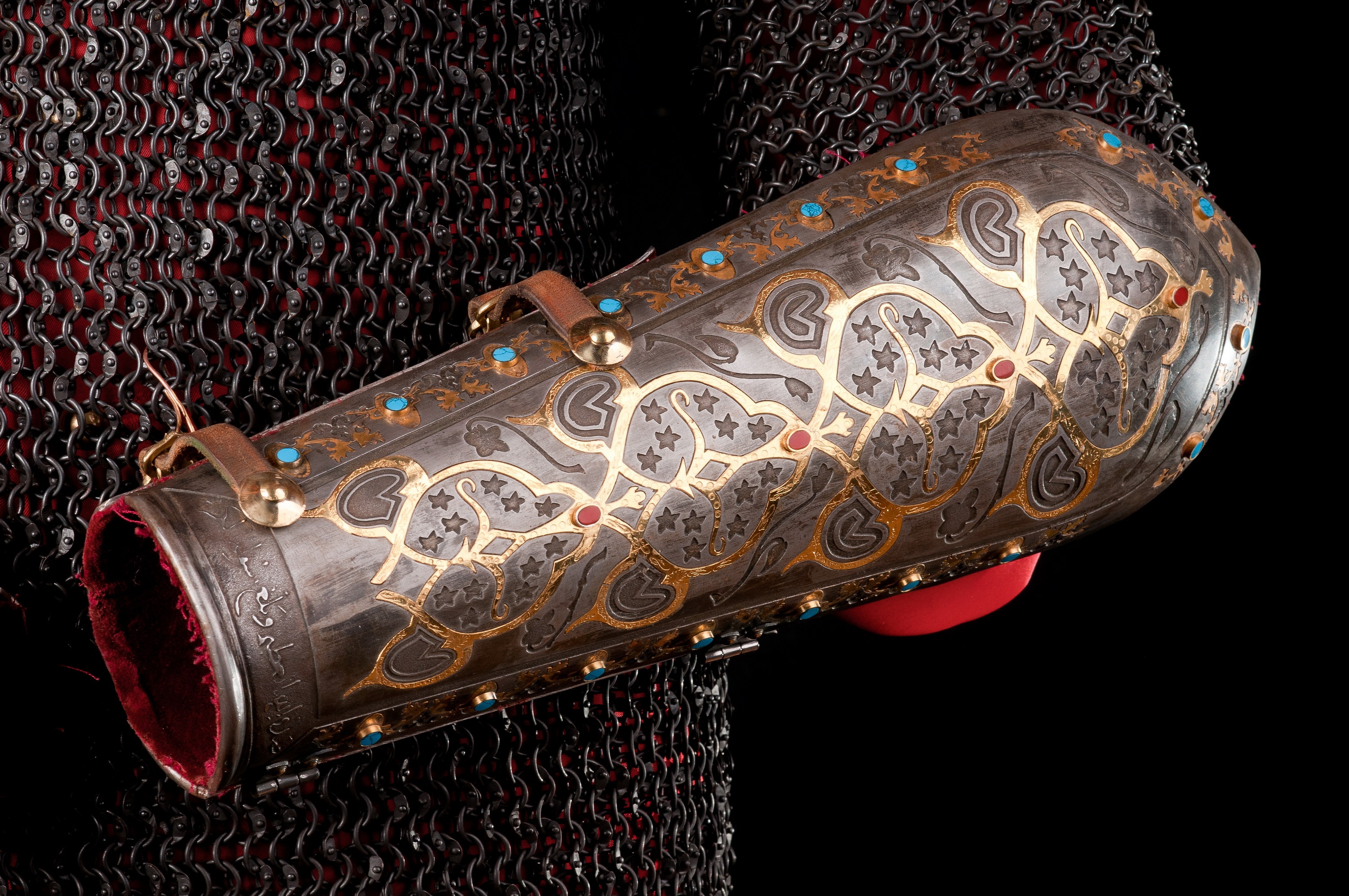 Данный набор доспехов характеризуется высочайшим качеством изготовления. К работе над ним наша группа мастеров подходила как над произведением ювелирного искусства. Все детали начиная от 35 тысяч склепанных колец кольчуги до лопастей наручей изготовлены очень тщательно. Применены техники: травления, золочения, инкрустации металла. Для украшения были использованы полудрагоценные камни коралл и гранат.