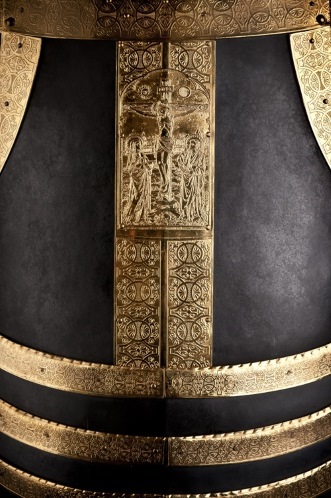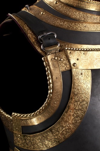 Все детали кованы в ручную, применялась травление, шлифовка, воронение. Детали доспеха украшены гравированными медными полосами с позолотой. Подшлемник и подкирасник на бархате, как и в оригинале.