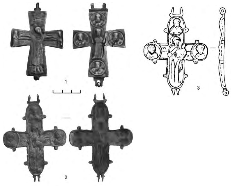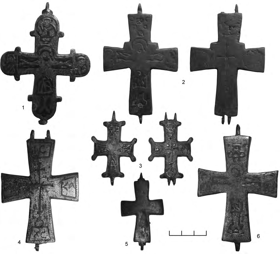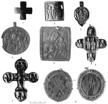 На сельских поселениях Черниговского Полесья немногочисленную, но весьма показательную группу составляют предметы христианского культа. К ним относятся и предметы личного благочестия (кресты-энколпионы, кресты-тельники, иконки), и детали церковной утвари (фрагменты хоросов, части кадил-кацей, лампадка) (рис. 1). Большинство предметов христианского культа обнаружено при археологических разведках и раскопках сельских поселений. Кроме этого, в настоящей сводке учитывались и случайные находки c селищ, хранящиеся в фондах Черниговского исторического музея имени В.В. Тарновского.