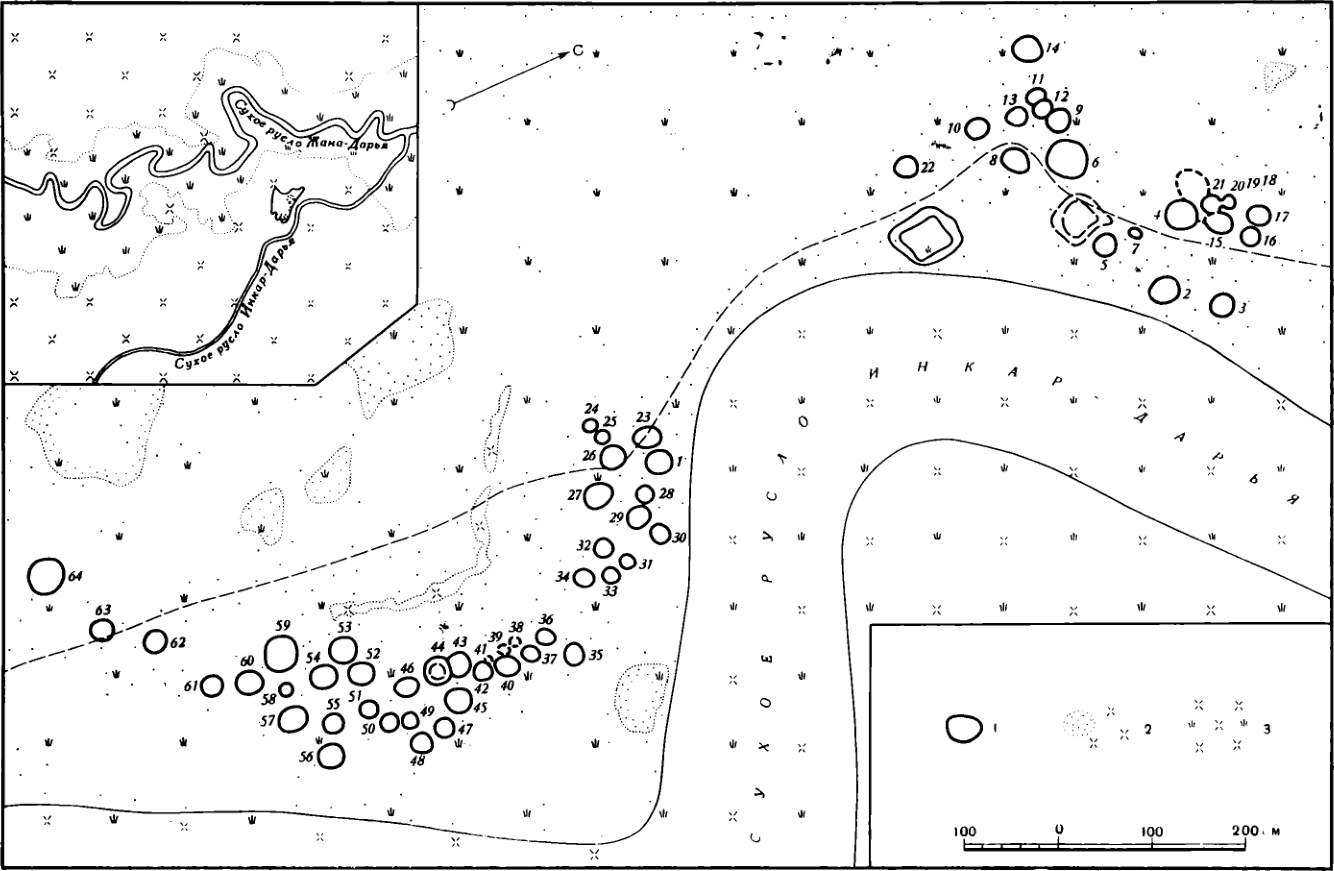 1 — курганы; 2 — пески и такыры; з — заросшие такыры