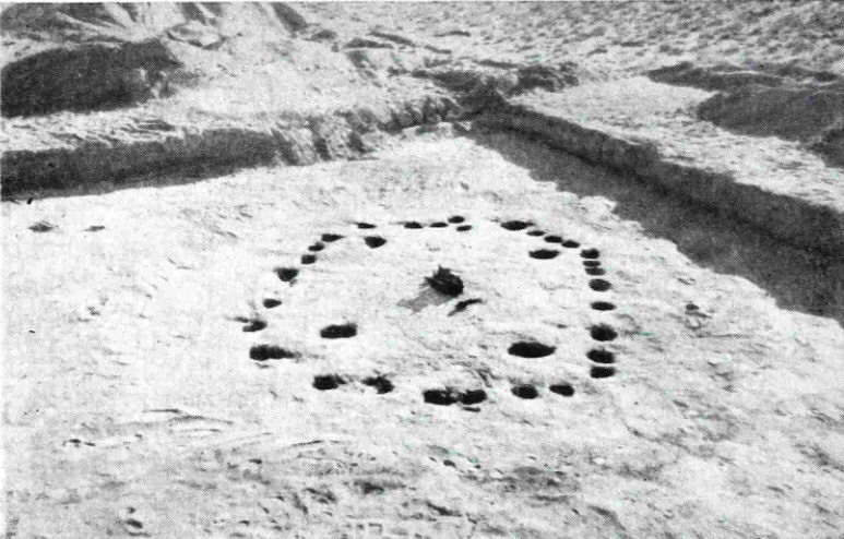 В угловых ямах, как правило, остатков столбов мы не встречали. В ряде случаев в них находились предметы погребального инвентаря, а подстилка из дерева и камыша, на которой лежал покойник, часто перекрывала эти ямы. Может быть, они служили для столбов паланкина, воздвигаемого над покойником во время совершения погребального ритуала, но скорее всего они существовали уже чисто традиционно, не используясь по назначению. Напомним, что в мавзолеях на Северном Тагискене деревянные столбовые конструкции играли большую роль, а в наличии культурной преемственности между этими памятниками и описываемыми мы будем иметь возможность убедиться еще не раз. В этой связи большой интерес представляют погребения, датируемые тем же временем, но относящиеся к другому типу. Большинство их найдено на Уйгараке. На Тагискене обнаружено лишь три таких погребения, и все они расположены в средней группе. Эти погребения были совершены не в грунтовой яме, а на дневной поверхности, причем покойник был окружен кольцом (иногда двойным) столбовых ям. На Тагискене это кольцо одинарное, причем оно имеет несколько вытянутую форму, а внутри него четыре более крупные столбовые ямы образовали прямоугольник, в центре которого лежал покойник и сопровождающий его инвентарь (рис. 2).
