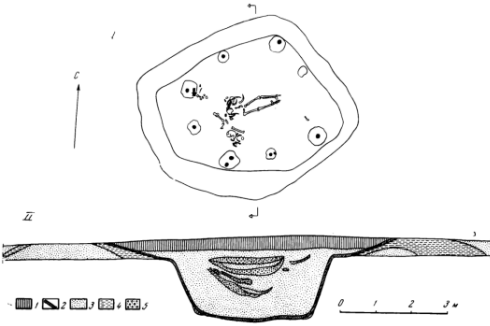 Могильник Тагискен. Кург. № 59. . План: 1, 4 – наконечники стрел; 2 – кольцо; 3 – кинжал; 5 – меч; 6 – нож; 7 – золотая пластинка (16 – железо). II. Разрез: 1 – песок; 2 – песок с золой; 3 – следы интенсивного горения.