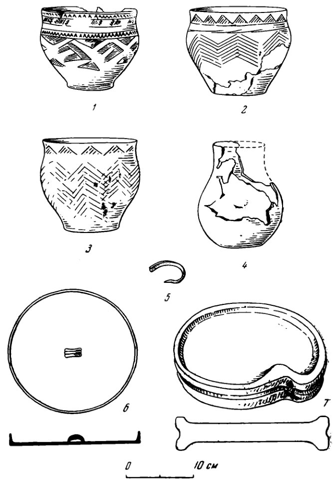 Сосуды (рис. 5, 1-3) находят себе прямые аналогии в материалах ранних мавзолеев Тагискена, причем на этих экземплярах очень четко прослеживается андроновский компонент этой культуры. Интереснее всего, что эти сосуды найдены в комплексе с бронзовым дисковидным зеркалом с бортиком и петлевидной ручкой (рис. 5, 6), каменным жертвенником (рис. 5, 7) и грушевидным сосудом серого лощения (рис. 5, 4) – предметами, характерными уже для ранних сакских захоронений. Весь комплекс в целом может быть датирован VII-VI ив. до н. э.6.