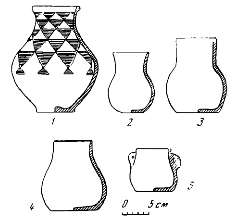 Сосуды (рис. 6) найдены далеко не во всех погребениях. Обычно их ставили в головах покойника, реже в ногах, причем ведущей формой являются сосуды грушевидной формы с высоким цилиндрическим горлом и плоским дном, часто лощеные. Сосуды этого типа встречаются в сакских погребениях VI-V в. до н. э. Быть может, прототипом этой формы является сосуд из ограды 4б на древнем Тагискене (рис. 6, І), сплошь покрытый орнаментом из резных заштрихованных треугольников, заполненных белой пастой.
