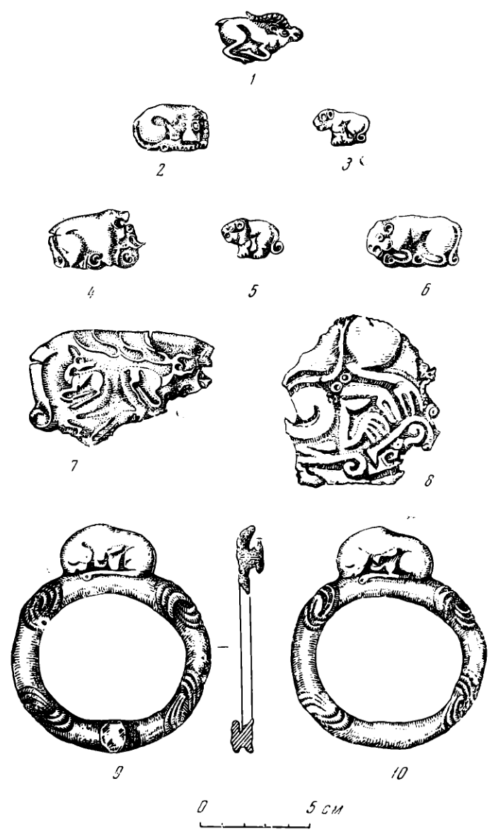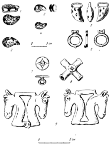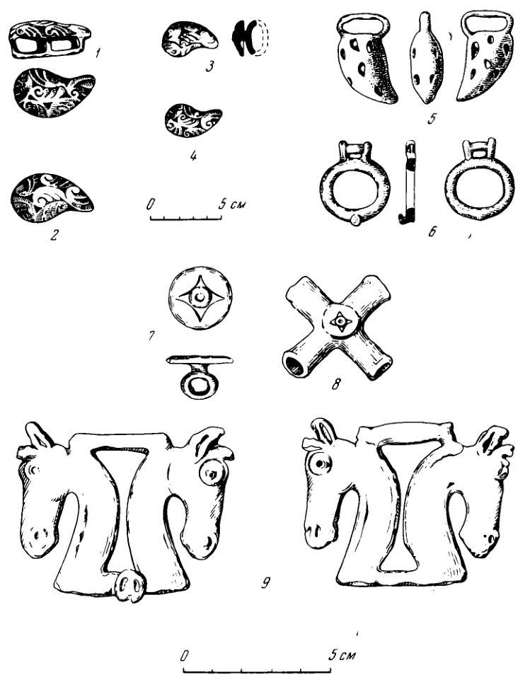 В ногах погребенных, независимо от их пола, лежали наборы предметов конской сбруи, сделанные из бронзы, причем в них входит множество всевозможных бляшек, подпружные пряжки, обоймы для перекрестных ремней, ворворки и т. д. (рис. 7). Многие из этих предметов были выполнены в характерном «зверином стиле». Среди изображаемых животных — олень, сайга, лев, грифон, лошадь, горный козел.