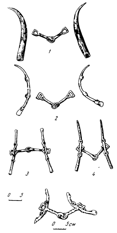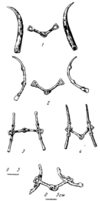 В связи с находкой на Тагнскене псалиев с прямоугольной скобой вместо среднего отверстия вновь встает вопрос о датировке фрагмента бронзового псалия, найденного на городище Кюзели-гыр в Хорезме14.