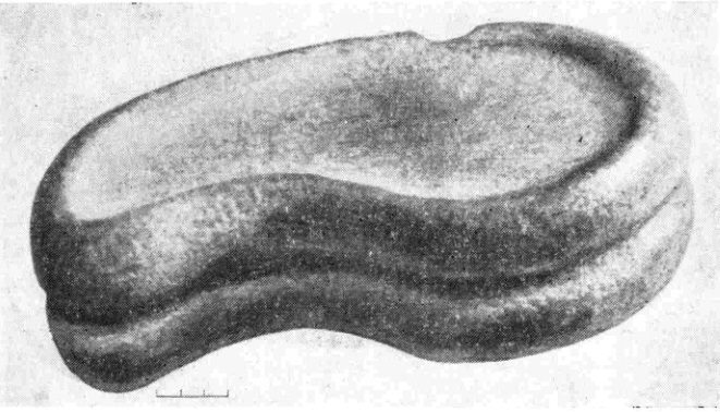 Большой интерес вызывает находка именно в женских погребениях каменных жертвенников. Обычно они без ножек, лишь в одном случае на Тагискене найден жертвенник с чуть намеченными ножками (кург. № 45); на Уйгараке есть экземпляр на четырех ножках. В большинстве случаев они имеют форму палитры (рис. 10), которую О. А. Вишневская находит возможным интерпретировать как стилизованный контур головы грифона. Реже жертвенники имеют овальную форму. Около них часто лежат кусочки реальгара, костяная пластинка или каменная плитка со следами краски. Как известно, такие жертвенники характерны для женских савроматских погребений Южного ГІриуралья, но там они чаще на ножках27; находят жертвенники с плоским дном и в курганах ранних кочевников Казахстана, но там их называют краскотерками.