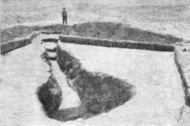 Для конструкции этих захоронении характерно наличие дромоса (рис. 11), ориентированного в большинстве случаев на юго-восток, длина его колеблется от 5 до 12 м. Устройство могильной ямы то же, что и в курганах VII-VI вв. до н. э., но она, как правило, довольно глубокая (2,2-2,3 м). Существенным отличием является иная ориентировка покойника, лежащего головой на восток — северо-восток. Яма обычно ориентирована углами по странам света, а не сторонами, как было в более ранних курганах.