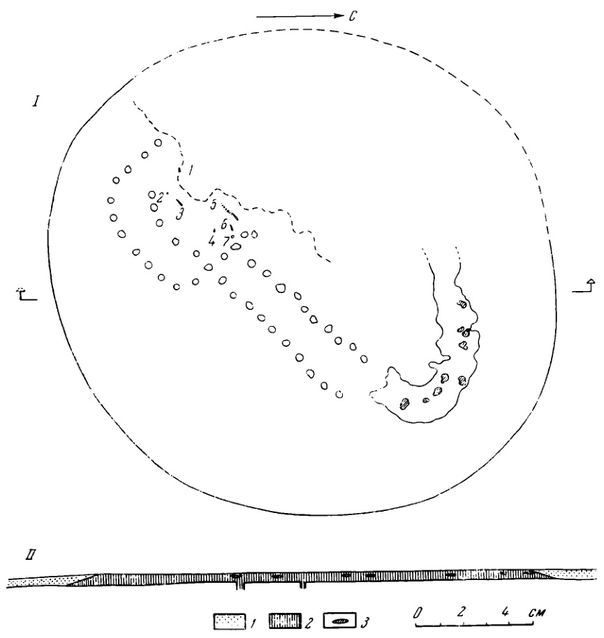 II. Разрез: 1 – песок; 2 – песок с золой; 3 – следы интенсивного горения