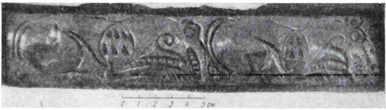 К этому же кругу памятников принадлежит и бляха в виде свернувшегося зверя, найденная в кладе на горе Азов (Свердловская обл.)36. Морда этого зверя по стилю более всего походит на морды зверей на ножнах тагискенского меча. Те же стилистические особенности (в первую очередь это касается зубастой пасти) наблюдаются и на амулетах из Блюменфельдского кургана А-1237.