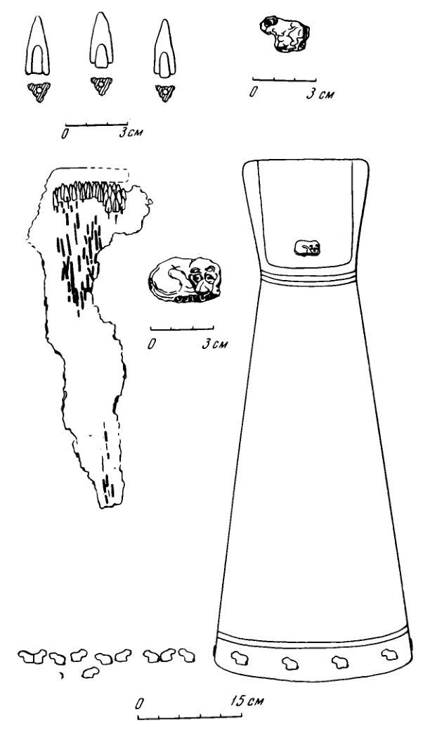 Помимо грушевидных сосудов мы находим также лепные кружки с одной или двумя ручками, полусферические чаши с несколько загнутыми внутрь краями, сосуды с трубчатым носиком — формы, широко известные в савроматском мире Поволжья и Южного Приуралья и в захоронениях ранних кочевников Казахстана.