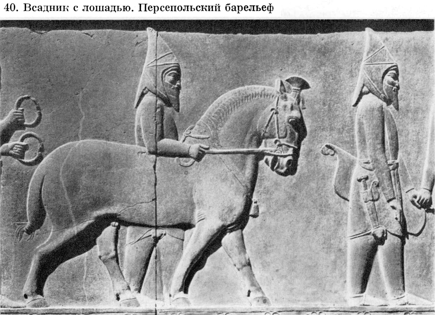 рельеф в Персеполе (совр. Иран) с изображением сакских воинов и коняИсследования последних лет оттесняют все более и более на восток границы скифо-сарматского мира и выявляют тот огромный массив племен, который населял азиатские степи в эпоху формирования и сложения скифо-сарматской культуры. Если принять во внимание, что скифская культура на территории Восточной Европы окончательно сформировалась в конце VII в. до н. э., что предшествующие ей культуры исследователи называют предскифскими, а не протоскифскими, что ранние памятники этой культуры сравнительно немногочисленны и дают материал, сходный с культурой азиатских степных племен, — невольно вновь приходят на память известные слова Геродота о том, что «...кочевые скифы, жившие в Азии, будучи теснимы войной со стороны массагетов, перешли реку Араке и удалились в киммерийскую землю...»53. Не являются ли наши материалы подтверждением рассказа, излагаемого Геродотом, прежде всего в той его части, где говорится об азиатской прародине скифов. Ведь то, что культура племен европейской Скифии не тождественна азиатской, отнюдь не является противоречием, ибо первые, помимо того, что они ассимилировали местные племена, подвергались сильному эллинскому влиянию.