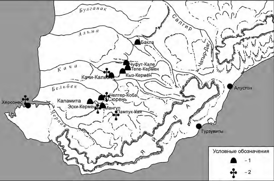 Находки древнерусских энколпионов в юго-западной части горного Крыма. Условные обозначения: 1 — «пещерные города»; 2 — места находок энколпионов