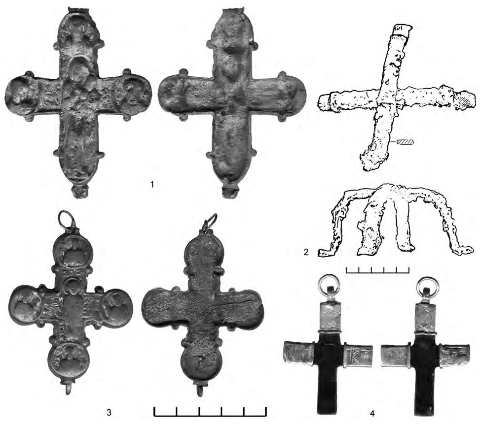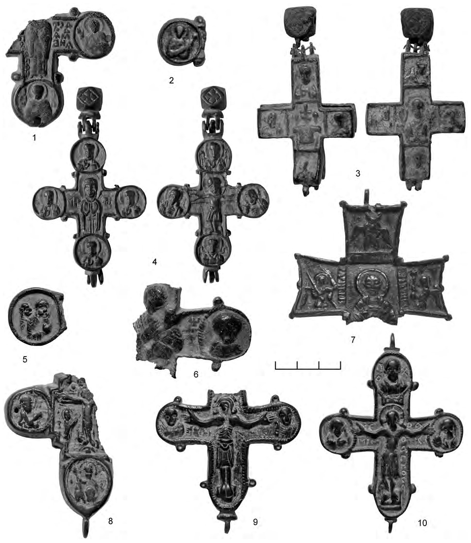 — фрагмент лицевой створки с рельефным изображением в средокрестии Богоматери Ассунты, на концах ветвей в медальонах — поясные изображения свв. Дамиана и Василия, на что указывают надписи (верхний и левый медальоны утрачены); с двух сторон от Богоматери зеркальные славянские надписи: слева — ПОМАГАН, справа — СТАА Б ДАМНА, внизу — ВАСНЛ; на концах обеих ветвей — сквозные отверстия (рис. 3: 1). Тип VII. 1.1.