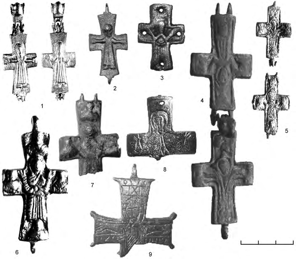 На территории Балкан могут быть отмечены изделия из Кале, Скопье (Od arkheoloskoto .1980: 139, № 81), а из византийской крепости на берегу Дуная Равна (III—VI вв.) происходит два креста. В первой публикации один из них, определенный как выполненный из серебра, был датирован VI в. В новом издании был уточнен материал (бронза) и датировка XI-XII вв. (MarjanoviC-Vujovic 1977: 45-46, № 42). Практически к этому же времени — X-XII в. — относится и экземпляр, хранящийся в музее Детройта (Sandin 1993: 52-54, fig. 13). Это именно тот хронологический интервал, которым датируется большинство подобных изделий.