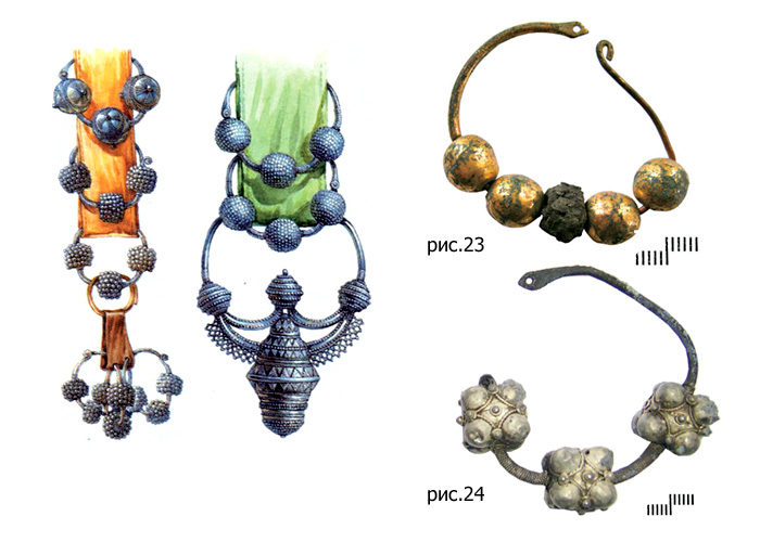 Отдельно следует выделить височные кольца с бусинами сложной формы, украшенными сканью, (рис. 24). Данный тип, называемый Киевским был широко распространен в XII- первой половине XIII в. в княжествах, находившихся на территории современной Украины.