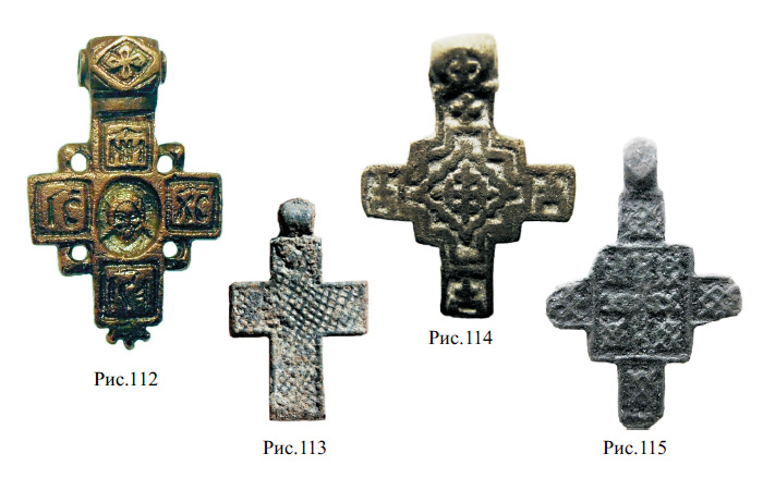Говоря о роли самостоятельных княжеств в развитии общероссийской культуры, в частности по теме этой книги, стоит подчеркнуть и роль Суздальско-Нижегородского княжества. Местоположение княжества на древних торговых путях, политическая поддержка Орды, способствовали его расцвету. С территории этого княжества происходят многочисленные находки оригинальных произведений металлопластики. В частности кресты представленные ниже, рис.113-117, отличаются своеобразием и оригинальностью. Время их бытования – последняя четверть XIV века и первая четверть XV века.