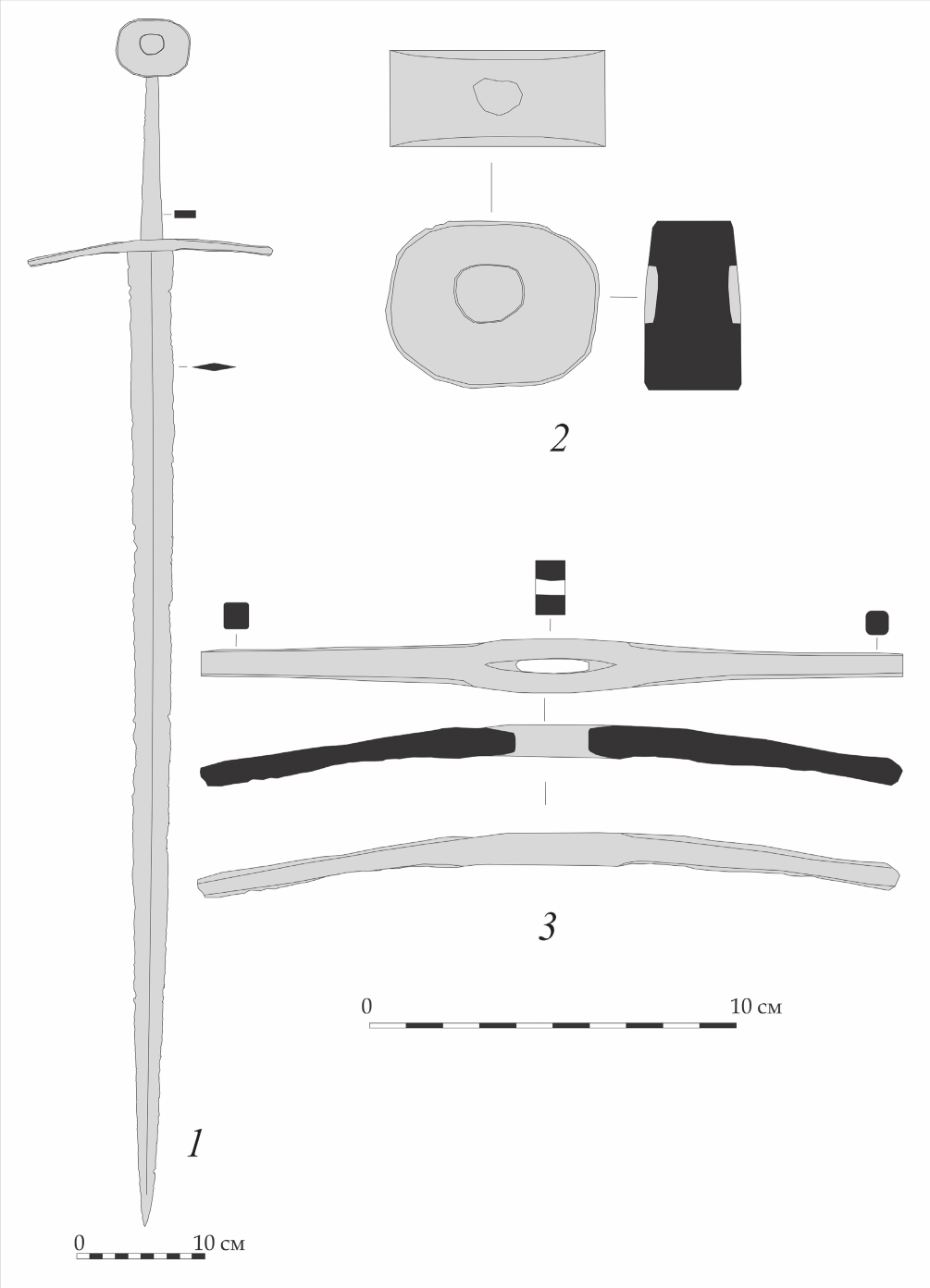 Как известно, любой меч развитого средневековья состоял из клинка и элементов составлявших эфес - крестовины, навершия и рукояти. У нашей находки узкий (ширина его у крестовины - 36 мм) обоюдоострый стальной клинок длиною 760 мм (см. рисунок, 1). Его лезвия постепенно сужаясь, примерно с нижней трети сходятся, образуя ярко выраженное острие. Посередине с обеих сторон, по всей длине, проходит ребро жесткости. Сечение представляет собой уплощенный ромб. Подобный клинок в основном использовался для нанесения уколов.