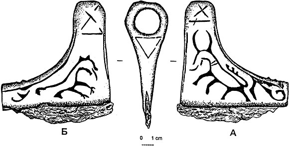 Напротив, мотив триплета и дракон, пронзённый мечём (деталь традиционной для готландских рунических камней 11 в. композиции "Тор в борьбе с Ёрмунгандом") связывает этот артефакт с североевропейским искусством поздней фазы эпохи викингов. Изображения на плоскостях топорика выполнены в наиболее сложном варианте плакировки, своей вершины (Стиль Гландо) достигшем в земле пруссов в сер. 11 в. (39). Это, скорее всего, соответствует датировке "княжеского" топорика.