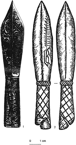 Через посредничество франкских мастеров эпохи Меровингов с искусством плакировки железа серебром (ferro splendio opus argento) познакомились жители Скандинавии эпохи викингов. Покрытое сакральным орнаментом оружие, несомненно, выполняло тогда магические функции. При этом высокий социальный статус воинов, обладавших блиставшим серебром оружием, был непременным и на севере Европы, и на Янтарном берегу (29), где традиции плакировки существовали вплоть до 14 в. В христианской средневековой Европе возведение в рыцари и прочие формы инвеституры, обозначавшие повышение социального статуса члена элиты общества, сохраняла видимость архаической магической подосновы этого акта (30). При этом роскошно декорированного оружия играло важную роль. Разумеется, предполагать наличие актов инвеституры в языческой Самбии пока не приходится.