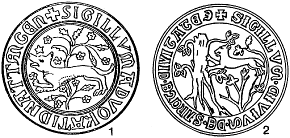 В материальной культуре Северной Европы наиболее ярко этот "волчий" аспект проявился в знаменном материале 11 в. На бронзовых полотнищах "штурмовых значков" викингов "Большой зверь" (= Фенрир) символизирует последнюю битву людей и богов с силами тьмы (15). В сознании последних язычников Европы данная эсхатологическая трагедия сопоставлялась с решающим сражением между христианством и традиционными верованиями, происходившим в Скандинавии и Балтии в 10-13 вв. Мифологические представления германцев о волке, звере-противнике царя богов Одина, как о мистической ипостаси силы и славы воина-профессионала получили неожиданное развитие в геральдических реалиях орденской Пруссии, особенно – на территории прусской земли Натангии. Изображения волка имеются на печати фогта Натангии (нач. 14 в.) (рис. 4, 1) – волк прыгает через куст цветущего боярышника) и на древнейшей городской печати г. Хайлигенбайля (рис. 4, 2). Этот сфрагистический памятник, появившийся не позднее 1344 г., представляет волка прыгающим через пень дуба. Как известно из местной нарративной традиции, священный для пруссов дуб произрастал поблизости от места будущего города Хайлигенбайля до 1301 г., в центре главного святилища пруссов Ромове (16). Кроме упомянутых печатей, изображение волка несла хоругви комтурства Бальга, располагавшаяся в 6 км к северо-северо-востоку от г. Хайлигенбайль.