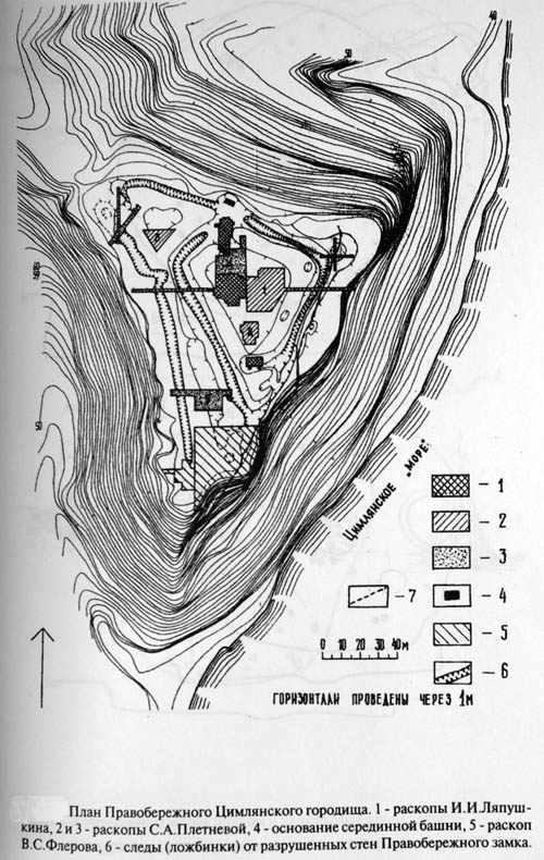 Под таким названием – «Правобережное Цимлянское городище» – нам сейчас известно это поселение – крепость. Настоящего его имени история не сохранила. Мне довелось съездить туда весной 2008 года. Расположено совсем недалеко, в километре наверное, не более, от поселка Саркел. Современного поселка, что стоит на высоком правом берегу Цимлянского водохранилища. И ничем, кажется, кроме названия, не связанного с тем, хазарским Саркелом, который остался на дне водохранилища. Подозреваю, что поселок назвали так из-за расположенного рядом Правобережного Цимлянского городища – приняли его, в момент основания при заполнении водохранилища, за Саркел.